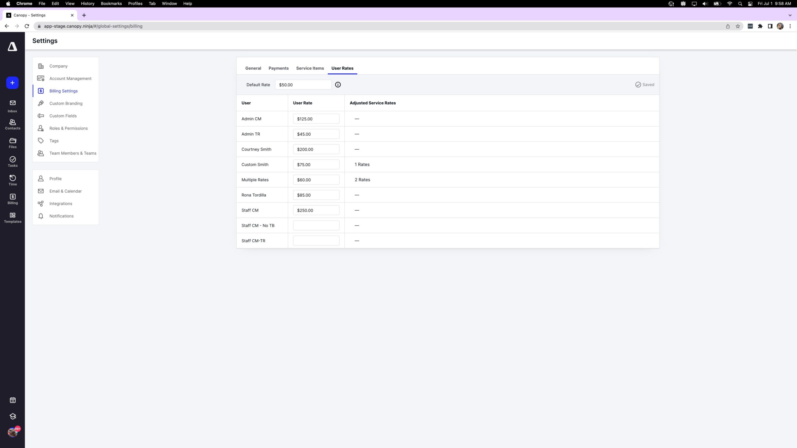 The easiest way to utilize this new feature is to have an admin set up the details in the settings tab before you perform a service, record a time entry on a task, or create an invoice. First, select the “Billing Settings” and navigate to the “User Rates” tab. This tab will look a little different now than what was previously here.
