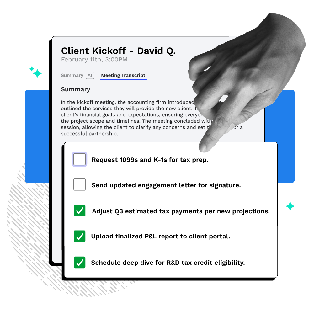 Step 3: After the meeting, check the Meeting Notes tab for your transcript, accounting-aware summary, and extracted action items—all linked to the client record. Edit if needed, then act on what matters.
